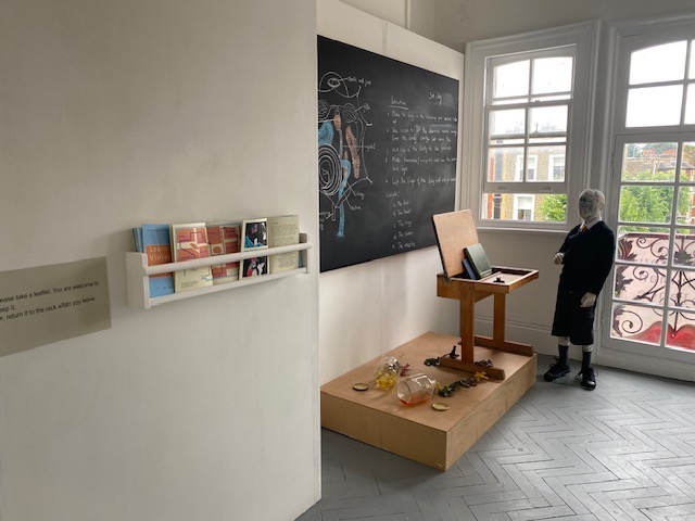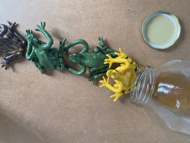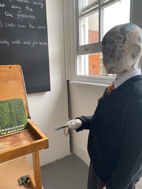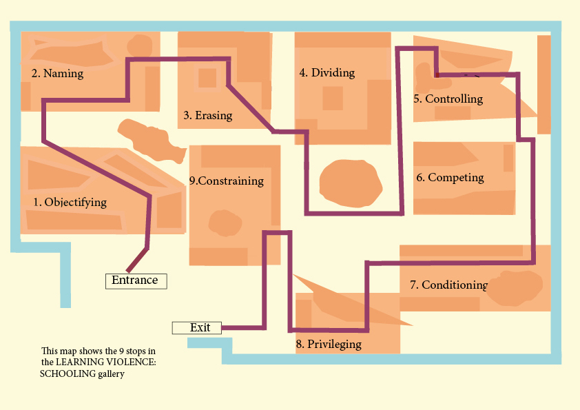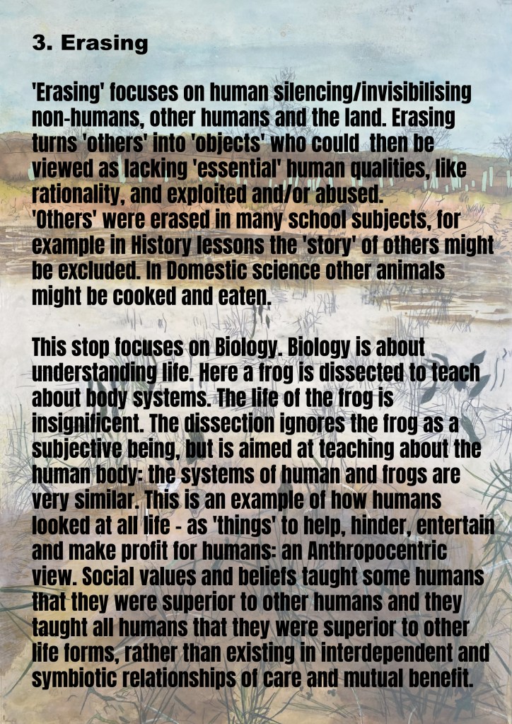 This installation in the Museum of Human violence focuses on a biology class. Ceramic frogs jump out of the specimen jars in protest. The violence of the instructions on the blackboard becomes normalised in the context of school and learning. As with the installation on learning violence: home, this installation is conceived as part of a larger gallery on schooling more widely. Posters, maps and free booklets are again available. (see below).