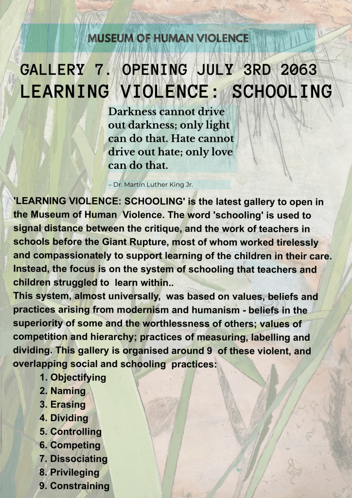 Schooling is probably not the first thing we think of when we think of children learning to normalise violence. Yet schooling pre-Rupture was based on a system of implicit violence, including competition, labelling, measurement and objectifying.